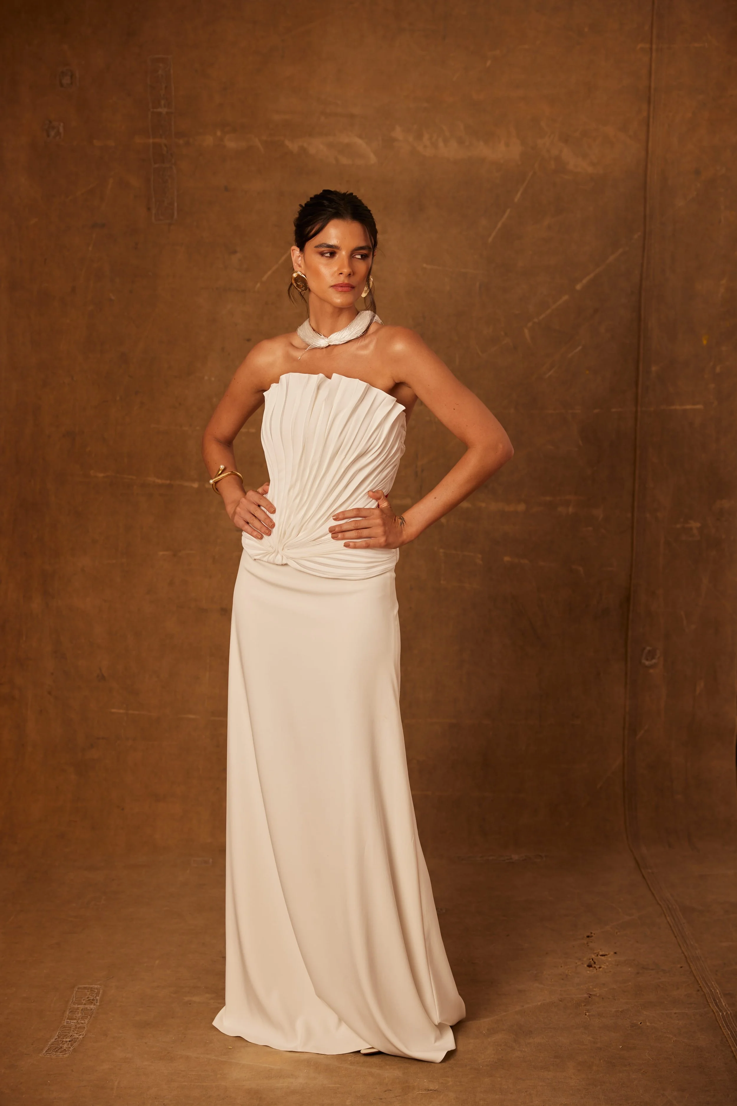As formas ondulam. O plissado cria ondas. O tule filtra a luz. O corset molda sem aprisionar. A maré ensina: força não é dureza. É constância.